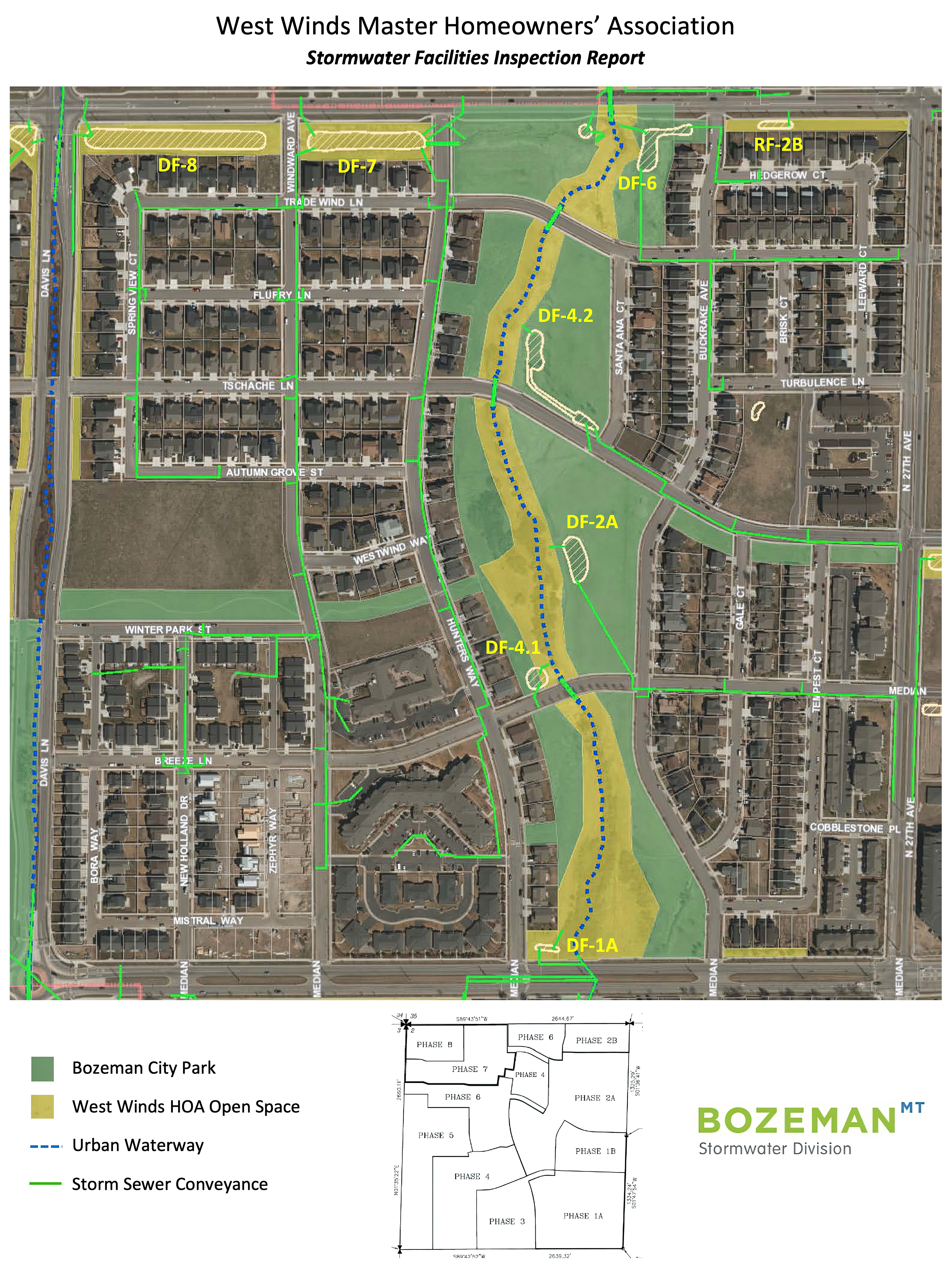 West Winds HOA is responsible for the maintenance and upkeep of "storm drains," also known as stormwater facilities and ponds, within the West Winds subdivision. This includes eight (8) detention or retention stormwater ponds.
